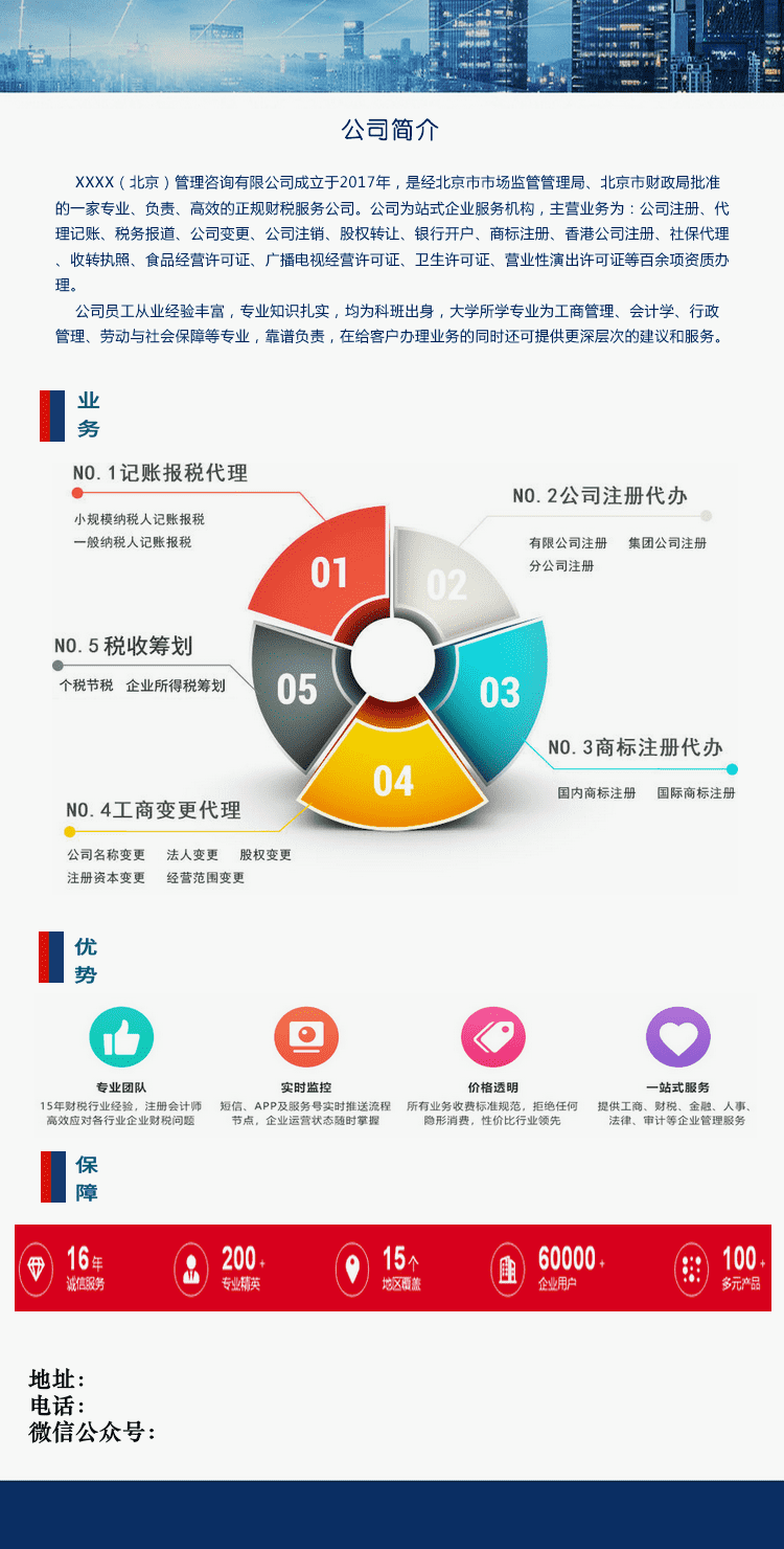 业务:公司注册、公司变更、公司注销、资质审批、代理记账、税务代理、财务顾问、税收筹划、社保代理、灵活用工、残保金筹划、公司法务